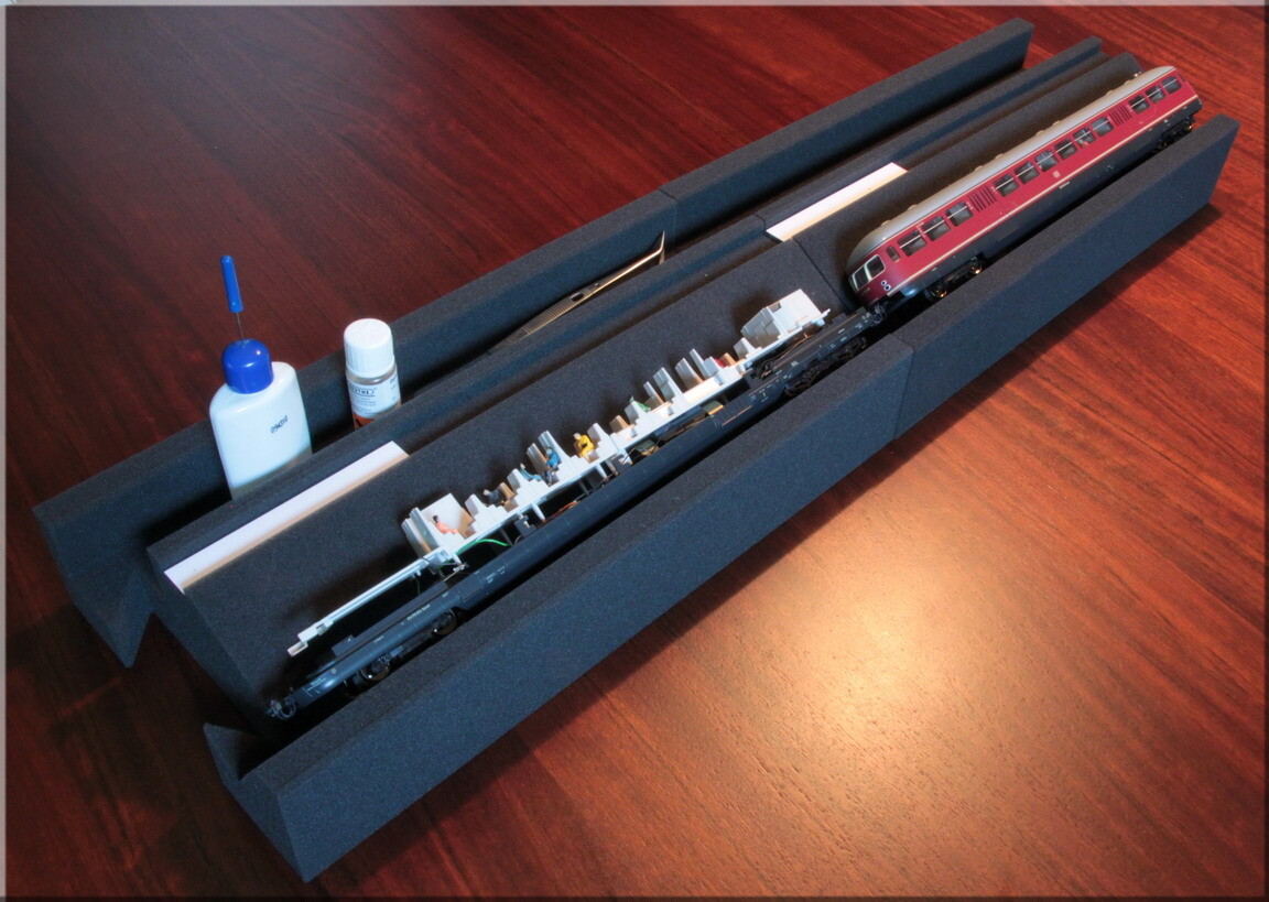 Diese Reparaturliegen werden aus sehr feinporigem Schaumstoff gefertigt. Dies garantiert, dass ein verhaken kleinster Bauteile in der Liege und damit der Abbruch verhindert wird.